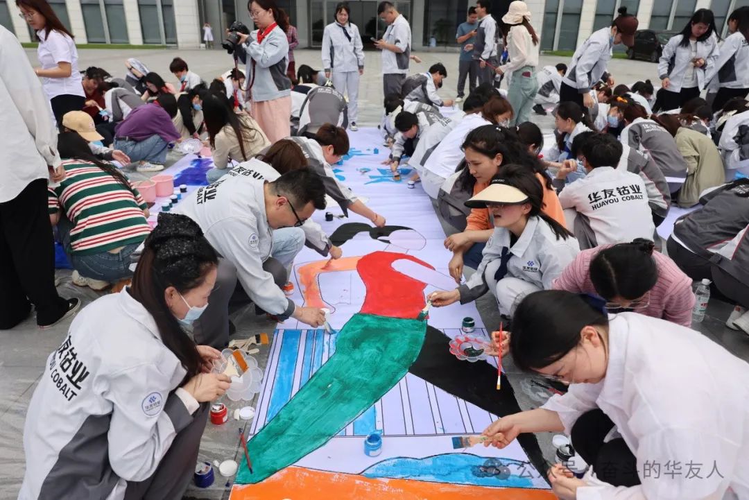 隨著畫布的鋪開,第二個項目開始。活動中,大家拿起手中的畫筆,端起五顏六色的顏料,在畫布上恣意揮灑著自己的熱愛與赤誠。通過近1小時的共同創作、潛心描繪,巨畫逐步完成,每一筆都體現出華友人的風采與魅力,每個人都是這幅巨畫誕生過程中不可或缺的一環。