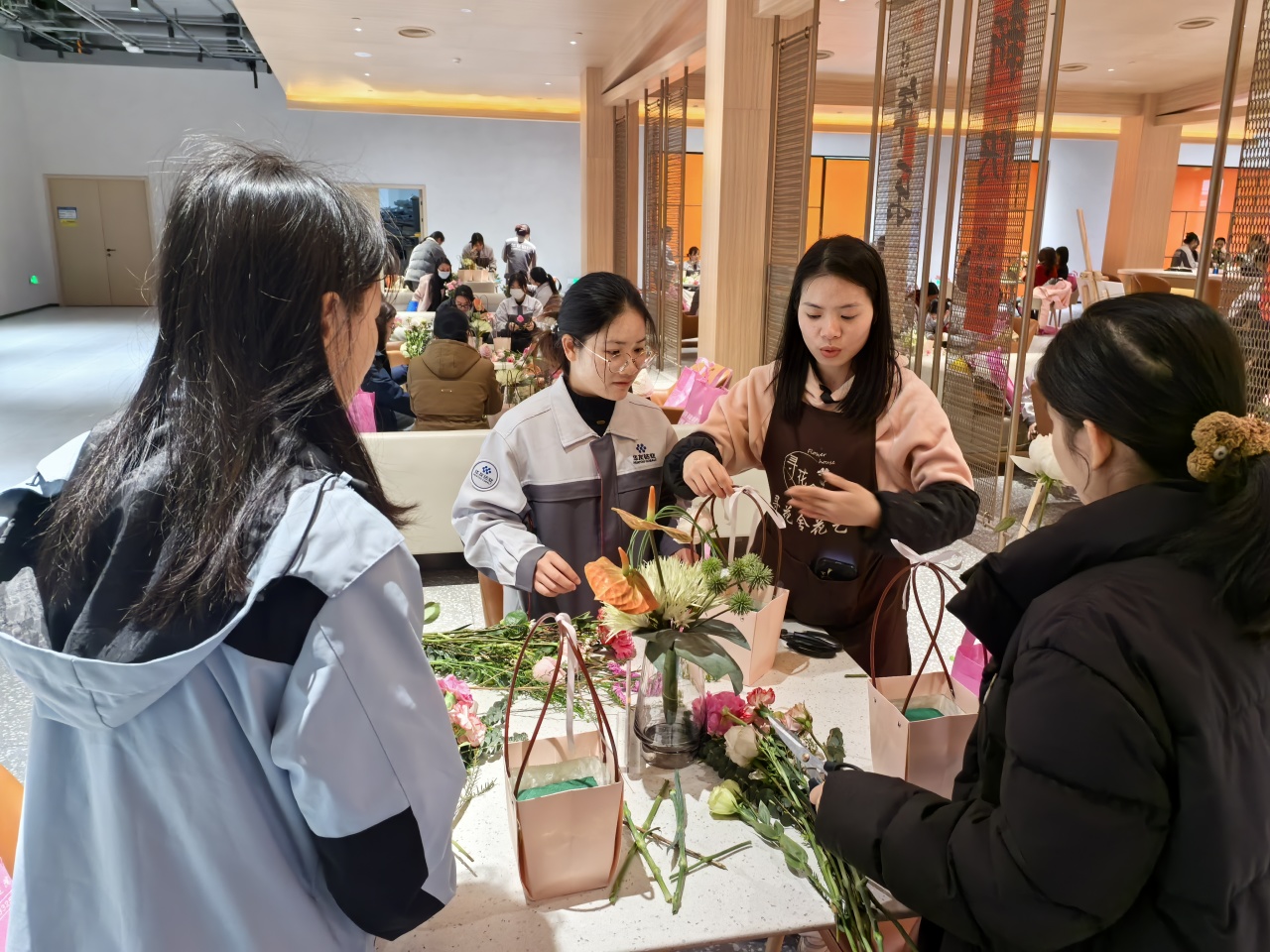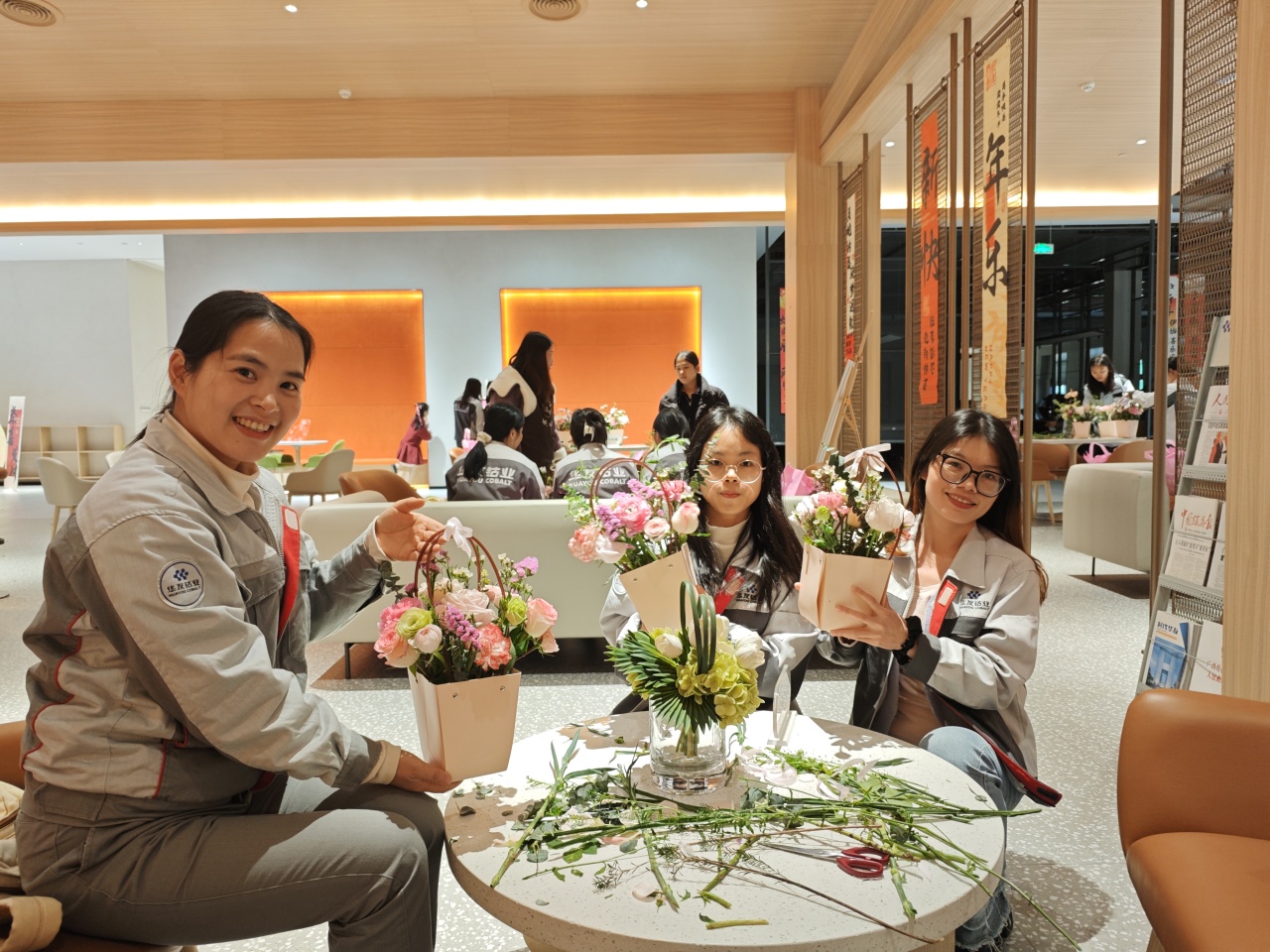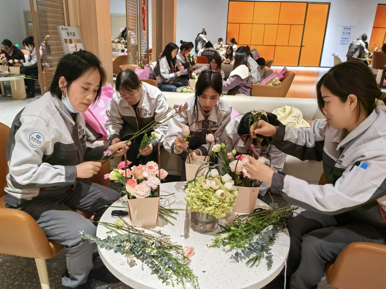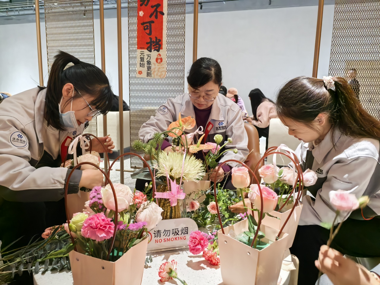 健康講座結(jié)束后,員工們在花藝師指導(dǎo)下進(jìn)行春日主題插花創(chuàng)作。拆開春日花材包的那一刻,商超休閑中心化作花香彌漫的創(chuàng)作空間。康乃馨的溫柔、洋桔梗的靈動、尤加利葉的堅韌…… 每一束花籃都是職場女性多重角色的生動寫照。