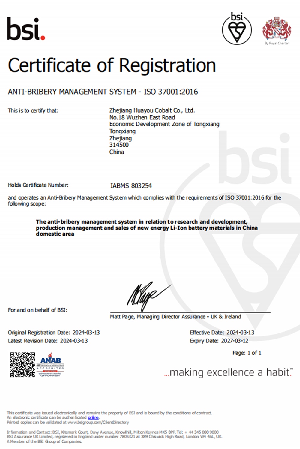 在英國(guó)標(biāo)準(zhǔn)協(xié)會(huì)BSI的審核下,華友鈷業(yè)通過(guò)反賄賂管理體系ISO37001:2016認(rèn)證并獲得相關(guān)證書,成為行業(yè)內(nèi)率先獲得ISO37001:2016認(rèn)證的企業(yè),在全球化合規(guī)治理上邁出重要步伐。