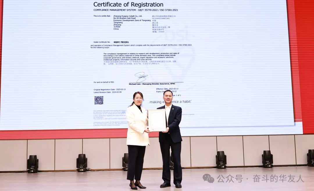 英國標準協會BSI 大中華區可持續發展總監楊曉曼女士,BSI中國區戰略業務發展總監郭玥婷女士分別為華友頒發ISO37001反賄賂合規管理體系初次認證及ISO37301合規管理體系擴證證書,集團總裁陳紅良代表公司上臺接受證書。